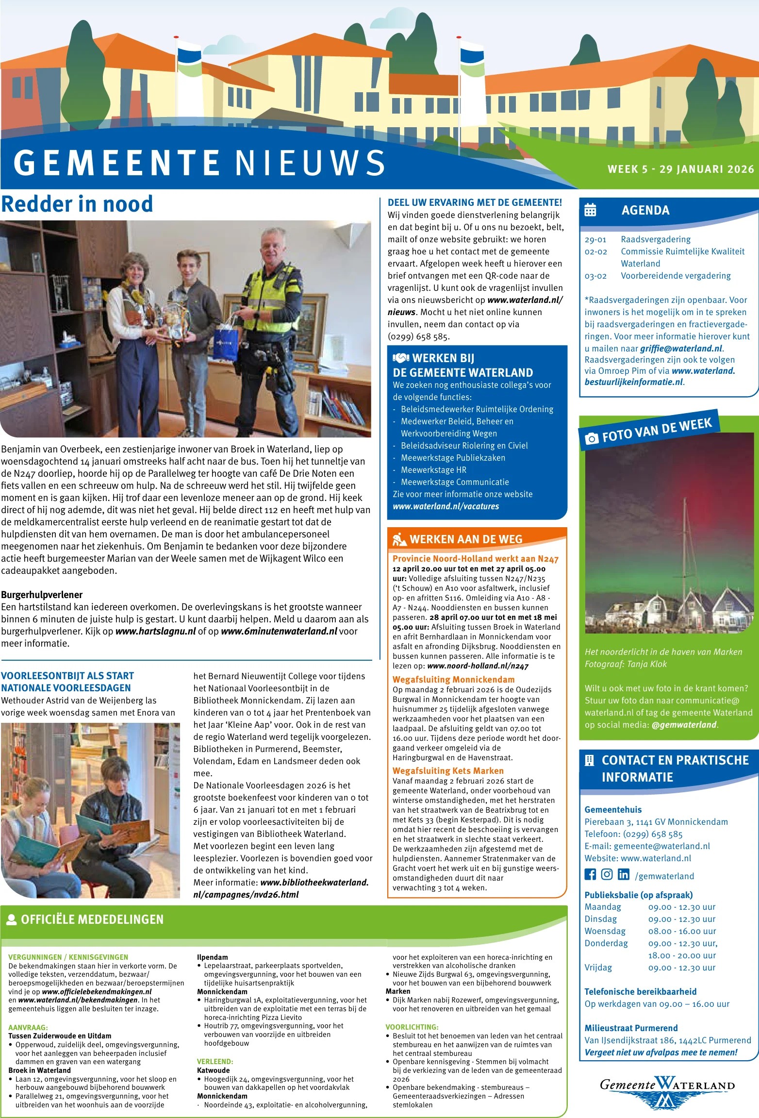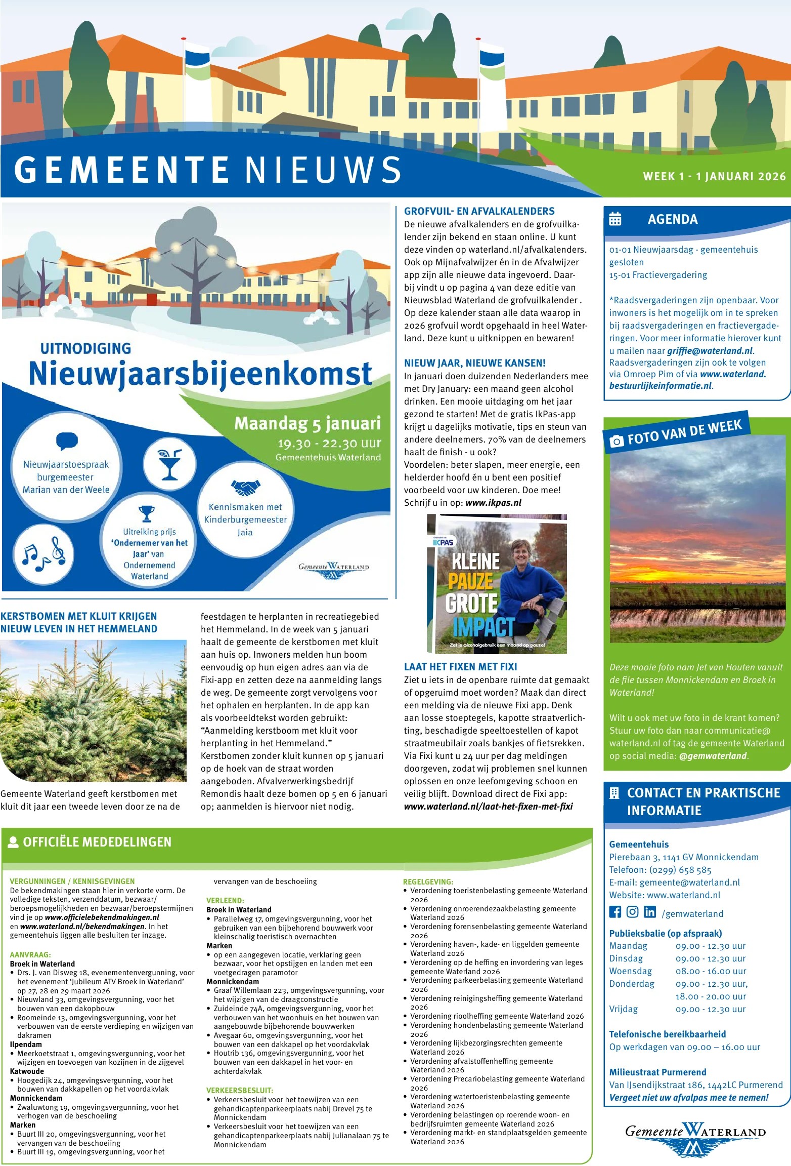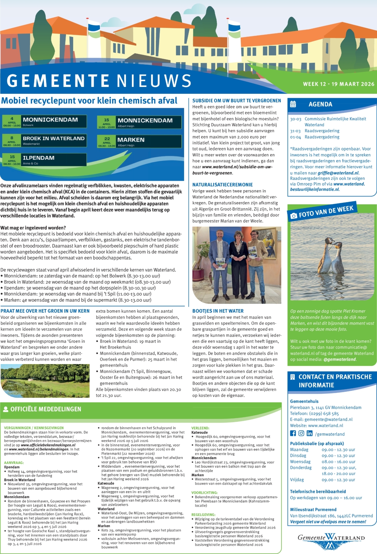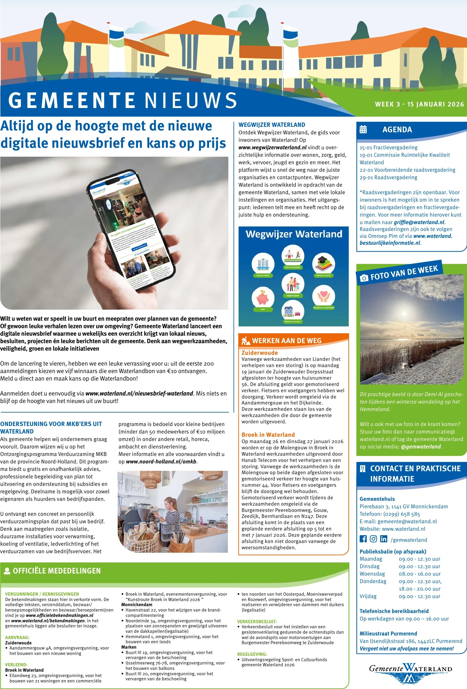 Informatie over bijeenkomsten, wegwerkzaamheden en andere wetenswaardigheden van uw gemeente leest u wekelijks op de gemeentepagina in Nieuwsblad Waterland, dat elke donderdag huis aan huis wordt bezorgd. Ook officiële mededelingen vindt u in verkorte vorm op de gemeentepagina.