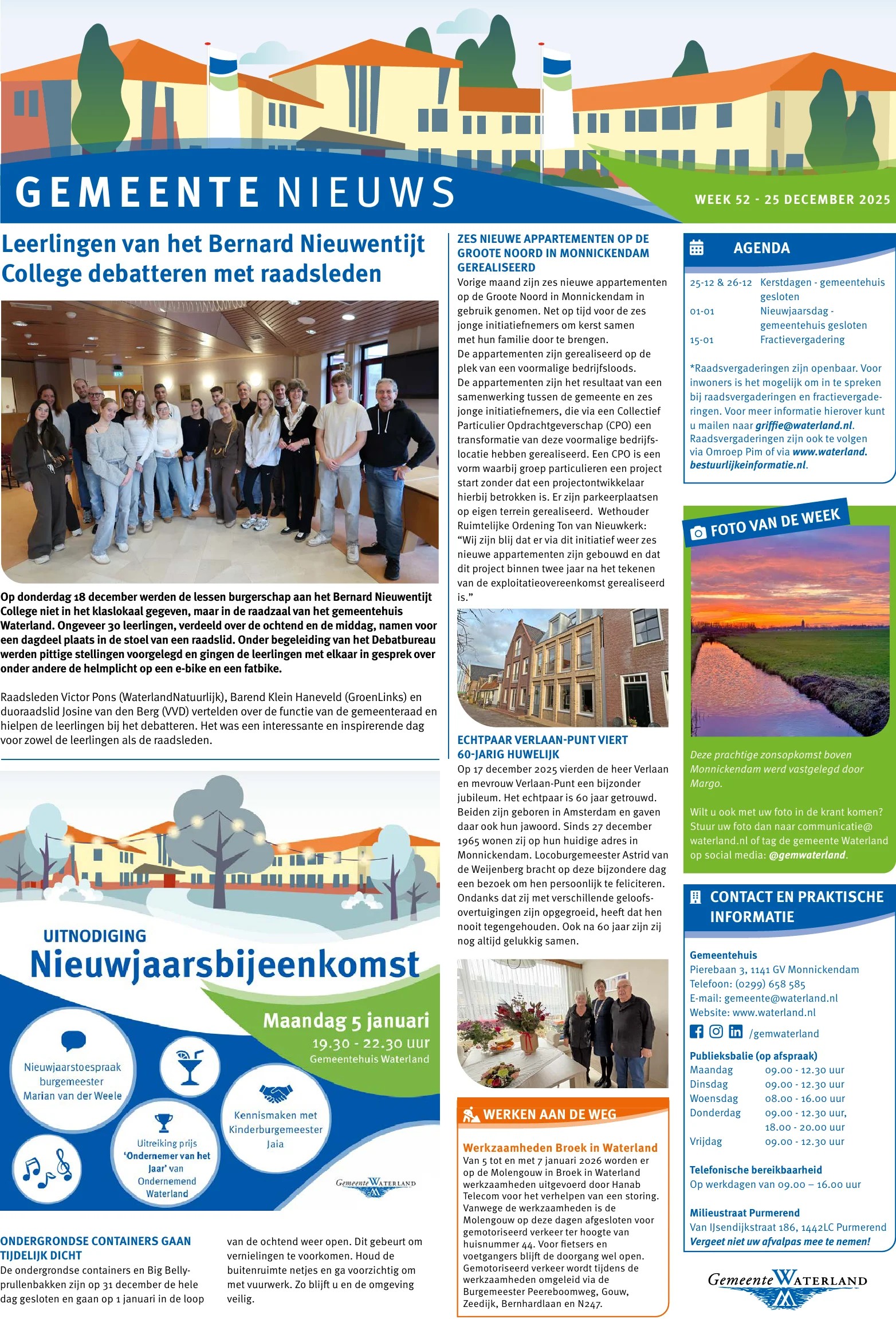 Informatie over bijeenkomsten, wegwerkzaamheden en andere wetenswaardigheden van uw gemeente leest u wekelijks op de gemeentepagina in Nieuwsblad Waterland, dat elke donderdag huis aan huis wordt bezorgd. Ook officiële mededelingen vindt u in verkorte vorm op de gemeentepagina.